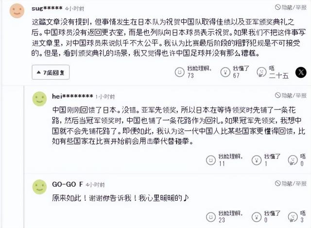 对此,日本媒体却只是单方面报道了日本球员向中国队的列队行为,而没有提到中国队的这个行为。这也直接引发了很多日本球迷的不满。有日本球迷留言,表示中国球员在亚军颁奖典礼之后,没有返回更衣室,而是同样列队向日本球员表示祝贺,如果不写进文章里,对中国球员来说太不公平。看到这一幕,我觉得中国足球并没有那么糟糕。
